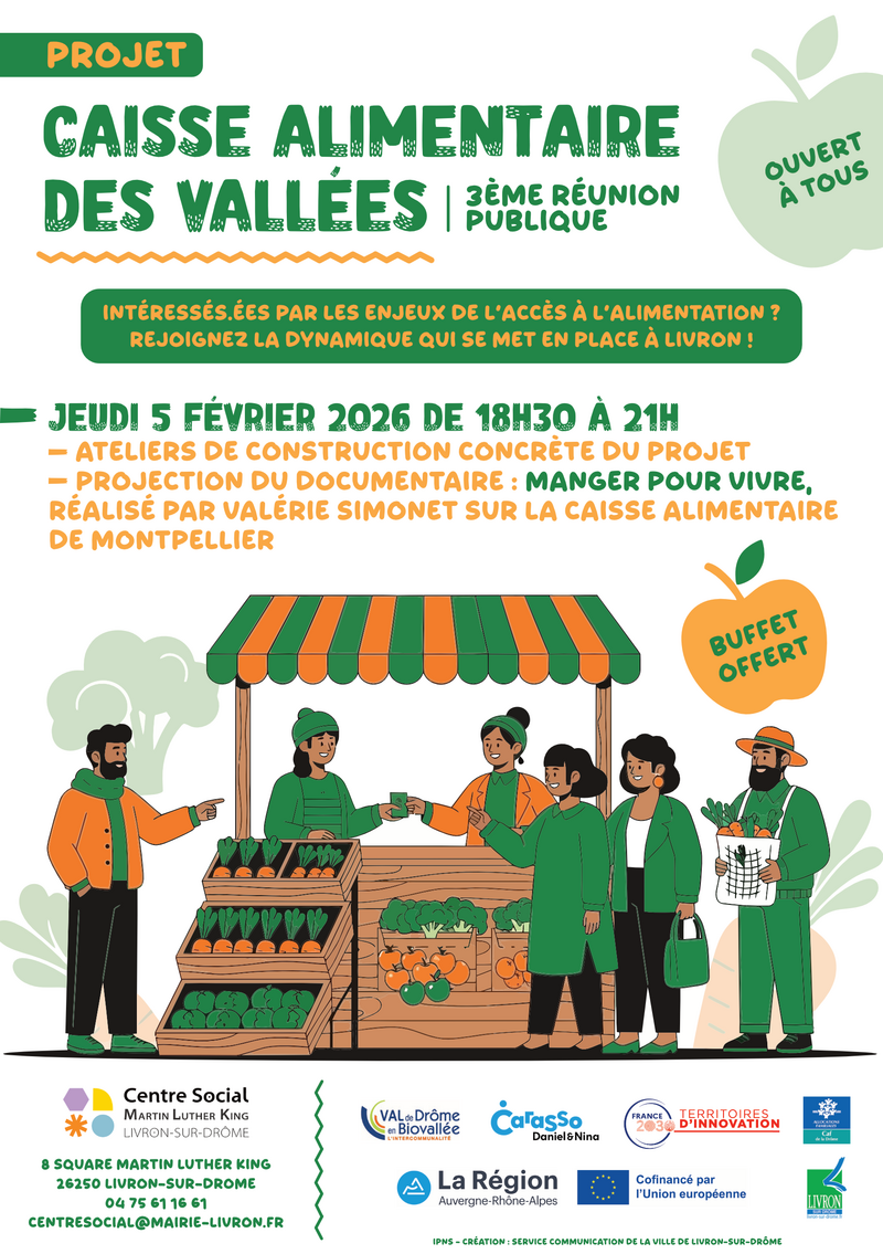 Le centre social de Livron-sur-Drôme et ses partenaires vous proposent un nouveau temps d'échange convivial pour avancer ensemble autour du projet de Caisse locale d'alimentation coordonné par la Communauté de communes du Val de Drôme en Biovallée.