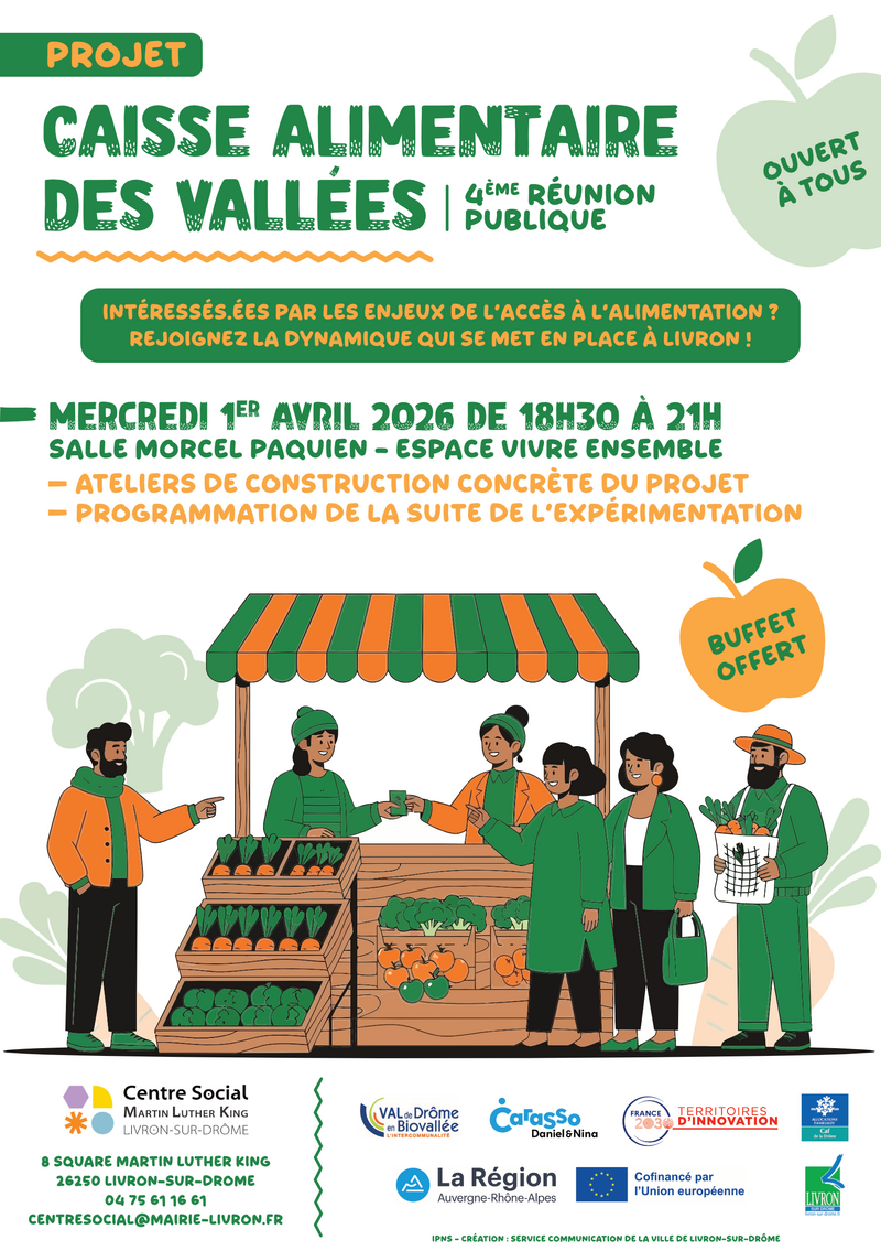 Le centre social de Livron-sur-Drôme et ses partenaires vous proposent un nouveau temps d'échange convivial pour avancer ensemble autour du projet de Caisse locale d'alimentation coordonné par la Communauté de communes du Val de Drôme en Biovallée.