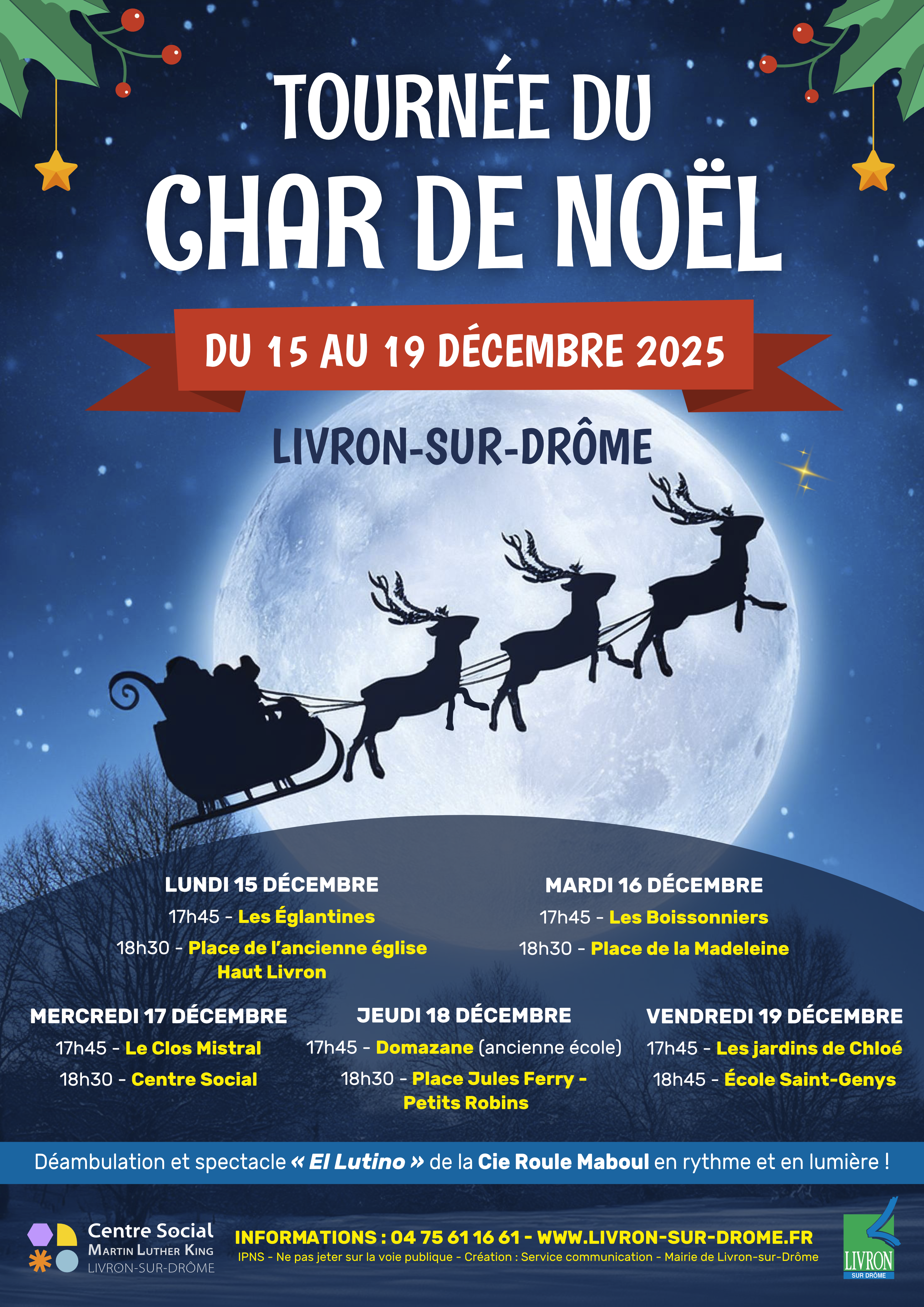 Le char du Père Noël sera accompagné par le spectacle El Lutino de la Compagnie Roule Maboul. Un temps convivial à la fin de la déambulation, autour d’un chocolat chaud sera proposé aux habitants !
