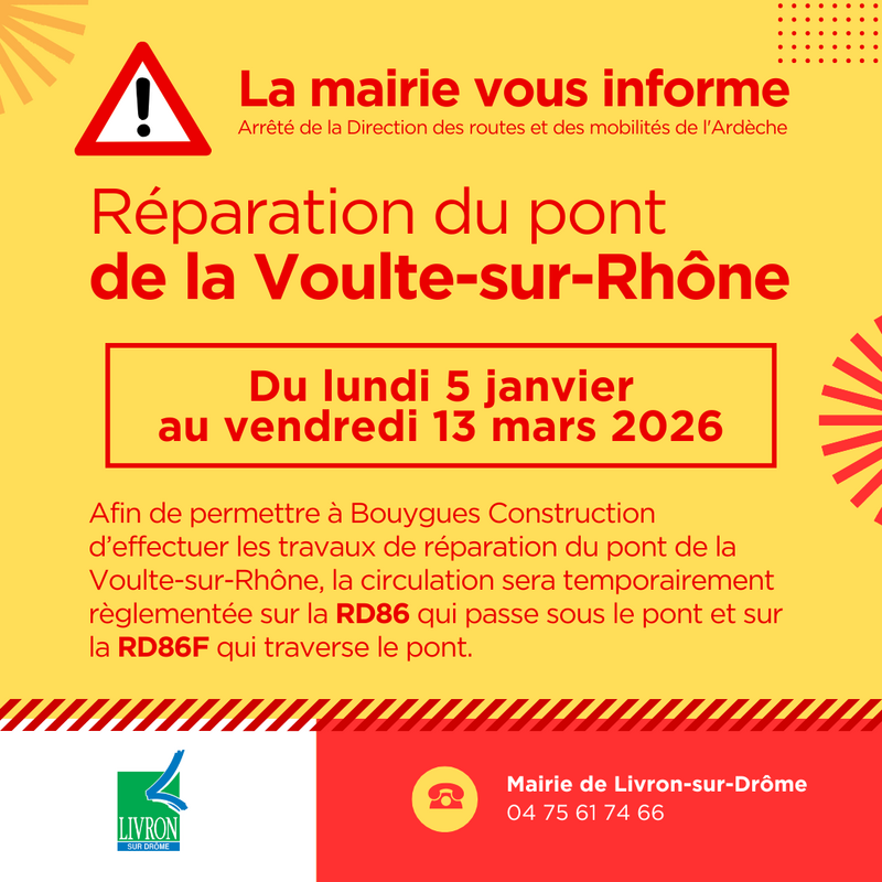 Afin de permettre à BOUYGUES CONSTRUCTION d'effectuer ces travaux de réparation du pont de La Voulte sur Rhône, la circulation sera temporairement règlementée sur la RD86 qui passe sous le pont et sur la RD86F qui traverse le pont, comme suit :