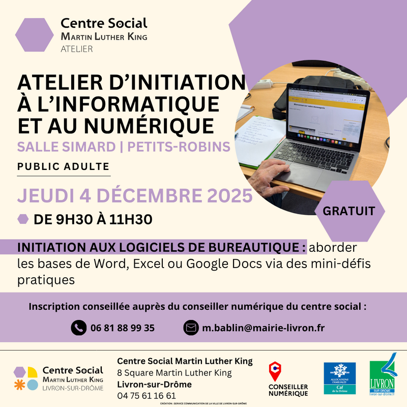 Thème de l’atelier : Initiation aux logiciels de bureautique : aborder les bases de Word, Excel ou Google Docs via mini-défis pratiques.
