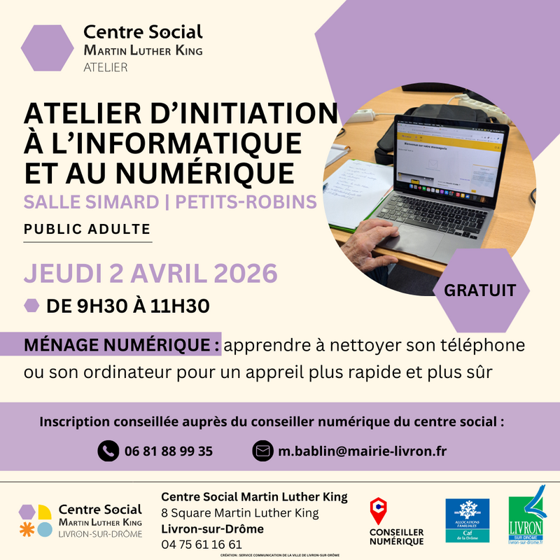 Inscription conseillée auprès de Maxime, conseiller numérique, par téléphone ou par mail : m.bablin@mairie-livron.fr