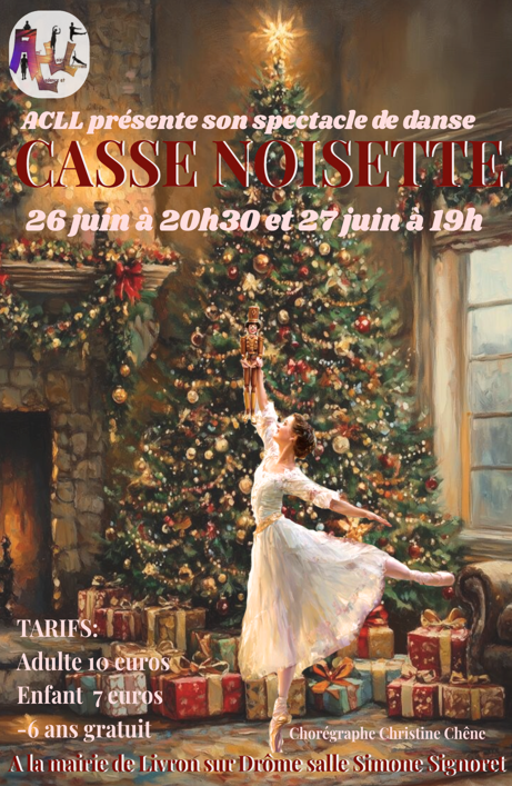 Ami Cadence Loisirs Livronnais vous invite à re-découvrir le chef d’OEuvre de Tchaïkovski avec son spectacle «Casse- Noisette» à l’occasion de deux soirées de représentation, les 26 et 27 juin en Salle Signoret. Ce spectacle sera l’occasion de mobiliser les danseuses et danseurs de la section Danse de l’association ainsi que ses bénévoles pour plus d’une 1h30 de spectacle pour petits et grands.